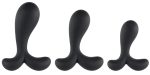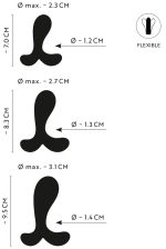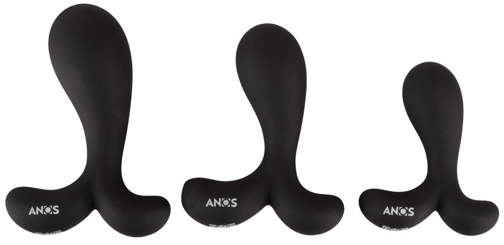 Butt Plug Training Set With Slightly Curved Tips from ANOS with 3 silicone butt plugs in different sizes and weights. Perfect for rectal stimulation and stretching training. Each smooth plug has a slightly curved, bulging tip to specifically stimulate the prostate (P-spot). The 2-armed stopper ensures a secure fit and fun as well as comfortable removal. All 3 butt plugs are made out of silky soft silicone with a flexible tapered part. For easy insertion, optimal fit and maximum comfort during anal training!