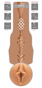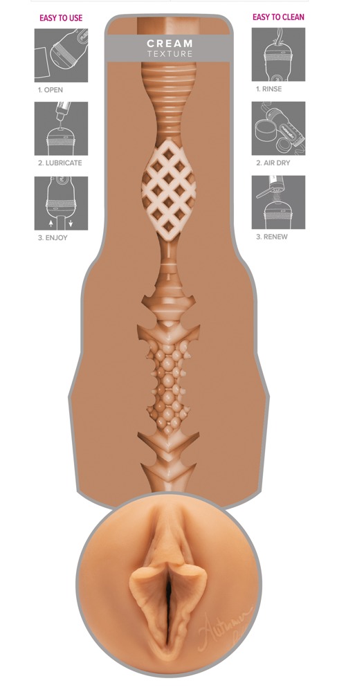 Masturbatorn Autumn Falls Cream från Fleshlight i en diskret ficklampsdesign med original formad vaginaöppning av erotikstjärnan Autumn Falls. Det väldigt variationsrikt strukturerade inre med olika diametrar är väldigt lik Autumns tajta vagina och ger en intensiv massage. Den inre hylsan av hudliknande, mjukt superskin-material har en autograf av stjärnan bredvid öppningen och hylsan kan lätt tas ut ur hylsan för rengöring. Den diskreta burken har lock.
