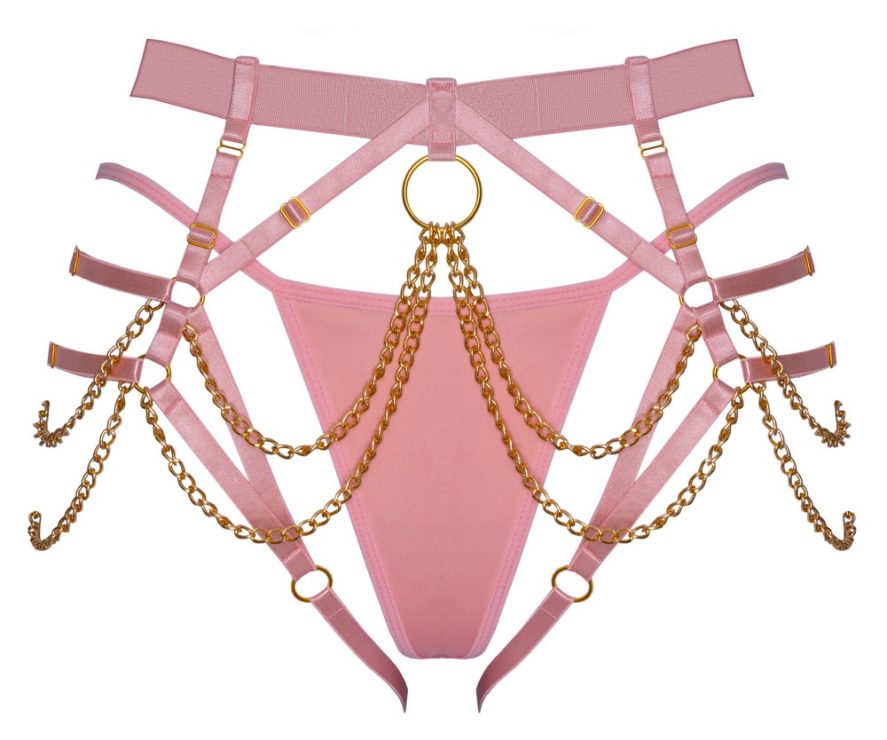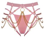 Extravagant harness string from Bad Kitty, including a mini G-string. Harness string made out of rose-coloured, elegantly shimmering stretchy straps with gold-coloured accessories. Swinging chains at the front and sides showcase the glamorous lingerie even more. The soft, elastic straps and wider waistband can be adjusted for a perfect fit. A rose-coloured mini G-string is included for a less revealing look.