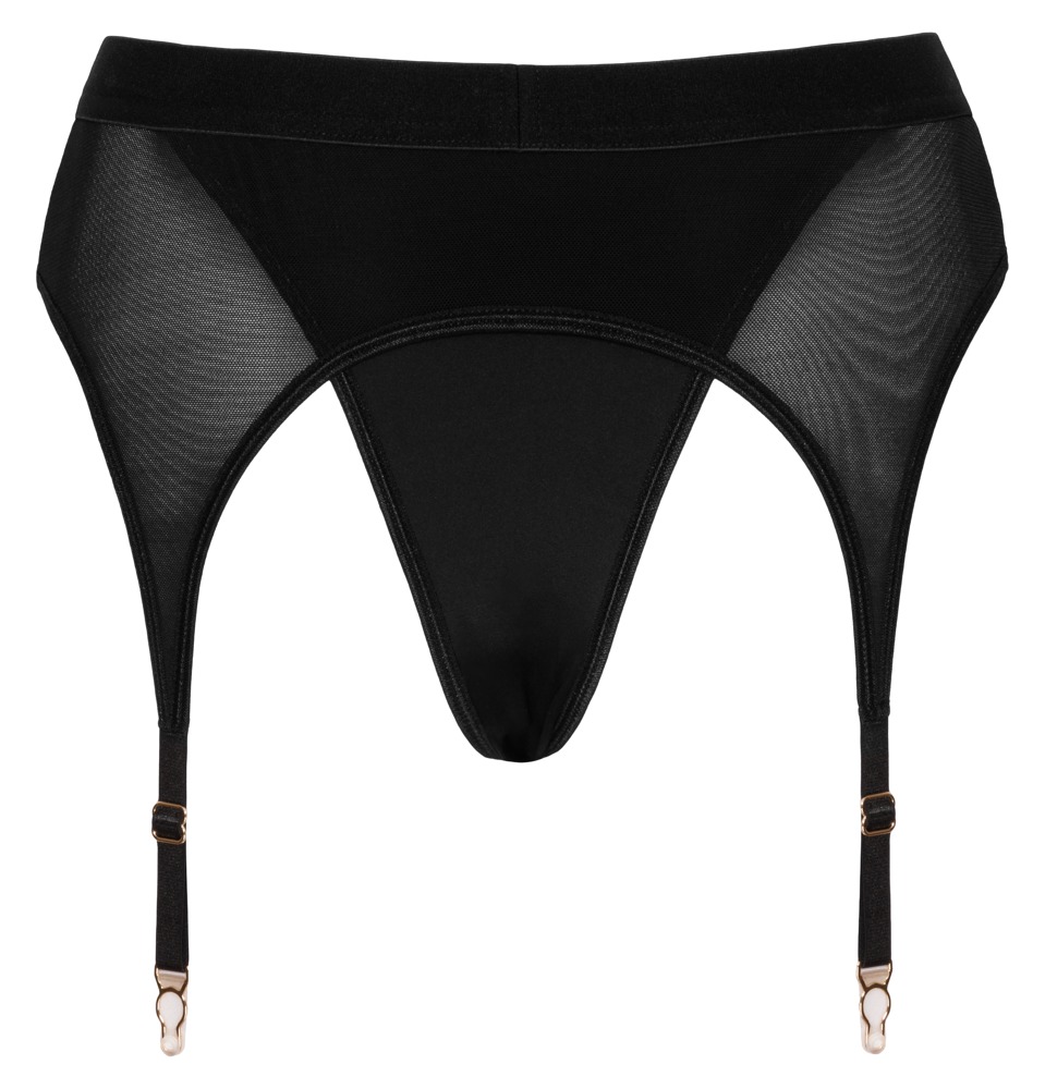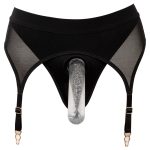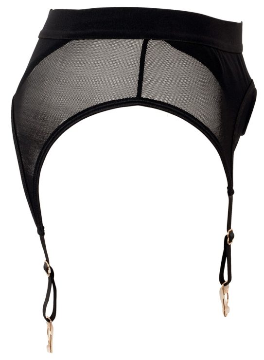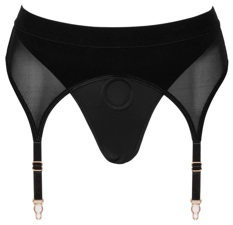 Svart strap-on riostring från Bad Kitty av mjuk mikrofiber kombinerat med en höfthållare av mjuk powernet. Stringen är sydd i dubbla skikt framtill och har en ficka och en inarbetad stretchring (Ø 3,5 cm) för att sätta i en dildo/vibrator med stå/sugfot. Strumphållarna kan justeras.