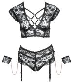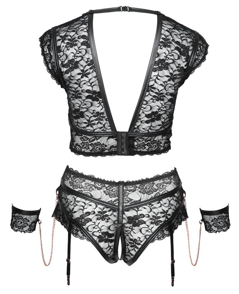 BH och öppen strumphållartrosa från Cottelli BONDAGE av mjuk, elastisk spets med mattlookränder och roséguldfärgade detaljer. Inklusive handbojor i spets som kan sättas fast i trosans ringar med karbinkedjor. Den mjuka BH´n är lite bredare och har remmar av stretchband vid den djupa urringningen. I nacken har BH´n en clips, baktill en hakknäppning. Trosa är öppen i grenen. De justerbara strumphållarna kan tas bort från trosan.