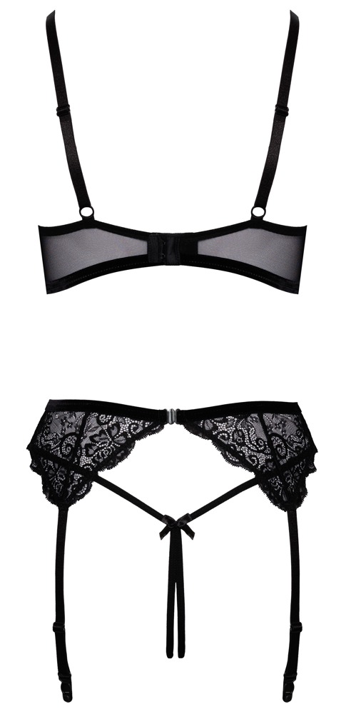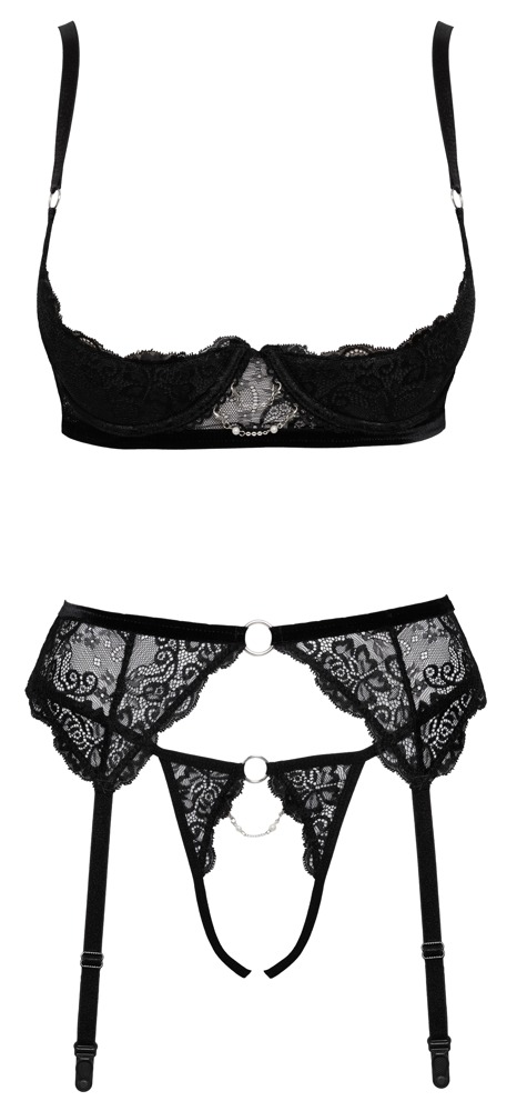 BH, höfthållare och öppen string i ett set från Cottelli LINGERIE. Allt av fin, mjuk stretchspets med silverfärgade ringar samt ädla sammetsdetaljer. Med avtagbara kedjor och pärlor mellan kuporna och i den öppna stringfronten. Den lätt fodrade bygel-BH´n presenterar brösten på bästa sätt. Axelbanden och hakknäppningen baktill kan justeras. Höfthållaren har justerbara strumphållare och hakknäppning baktill. Den lilla spetsstringen förför med en helt öppen gren och liten rosett över rumpan.