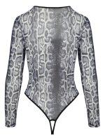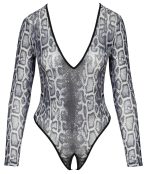 Extra djupt urringad, långärmad body från Cottelli LINGERIE i ormskinnsdesign. Helt av fin genomskinligt powernet. Elastisk och mjuk för maximal komfort. Riostringstilen med extra höga benskärningar presenterar ben och rumpa på bästa sätt. I grenen är den sexigt öppen.
