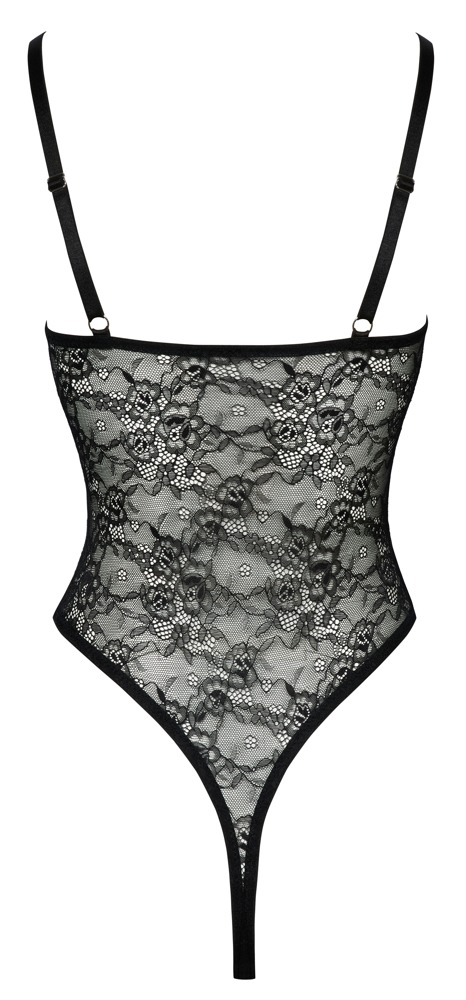 Öppen riostringbody från Cottelli LINGERIE av fin svart blomsterspets som är mjuk och elastisk. Med snygga elastiska remmar och silverfärgade ringar i urringningen. Axelbanden kan justeras. De extra höga benskärningarna presenterar ben och rumpa på bästa sätt. Bodyn är öppen över venusberget och i grenen.