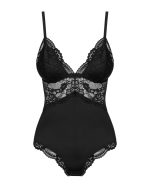 Snygg, svart body från Obsessive av mjukt stretchmaterial i kombination med fin, elastisk spets. Maximal komfort! Spetskuporna är ogenomskinliga och vadderade. Axelbanden kan justeras. Med hakknäppning i grenen.