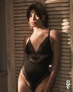 Svarta, eleganta bodyn Lobellis från Obsessive. Fin materialmix av sammetslen stretch och vacker spets på och under kuporna samt på benkanterna. Mjuk och elastisk för maximal komfort. Diskret smyckesdetalj mellan de mjuka kuporna. Axelbanden kan justeras. Med hakknäppning i grenen.