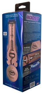 Masturbatorn Boost Blow från Fleshlight i ett diskret hölje med en realistisk munöppning. Invändiga Turbo Tech-ringar omsluter din penis och ger ett perfekt grepp. Den väldigt varierande strukturen invändigt med olika diametrar masserar din penis intensivt och orgasmeffektivt. Med den medföljande Suction Control Cap kan sugeffekten styras individuellt.