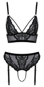 Bralette och öppen strumphållartrosa i ett set från Cottelli LINGERIE i svart fin mix av spets och powernet. Mjuk och elastisk för maximal komfort. Den bredare BH´n har stretchrem i urringningen, den högt skurna trosan har en helt öppen gren. Axelbanden och strumphållarna kan justeras, strumphållarna kan även tas av helt från trosan.