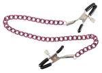 Dessa två bröstvårtsklämmor är sköna accessoirer som kommer göra din älskling galen av lust De båda klämmorna är förbundna med varandra genom en lila kedja. Klämmorna har gummihylsor och trycket kan individuellt justeras med justeringsskruvar. Vad väntar du på?