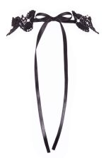 The black choker from Cottelli ACCESSOIRES is made out of delicate embroidery in a lace look. It is decorated with pearls and sparkly gems. It is soft and comfortable to wear. It is 3 cm wide/high. There are satin ribbons that tie at the back, which means that the choker is adjustable.
