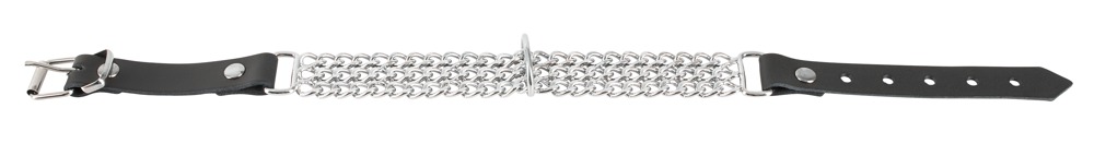 Svart läderhalsband med tre kedjor i metall. Varje kedja har en förbindelsering som bara väntar på ett koppel… Justerbart med spännen.