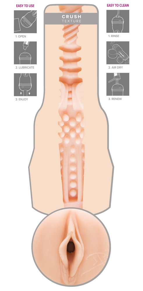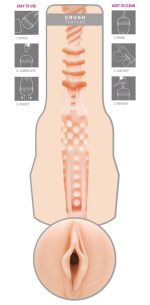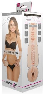 Hudfärgad masturbator med vaginaöppning. Originalavtryck av erotikstjärnan Dillon Harper Crush intimzon. Lustkanalen har olika stora noppor, lameller och räfflor för bästa stimulation. Med lock och stjärnans autograf bredvid blygdläpparna. SuperSkin Textur. Total längd: 25 cm. TPE.