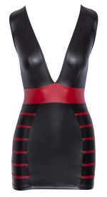 Tajt skuren, kort klänning från Cottelli PARTY i svart mattlook med röda ränder på kjoldelen och med röd midjeinsats som betonar kurvorna. Framtill extra djup V-skärning. Mjuk och elastisk för bästa komfort.