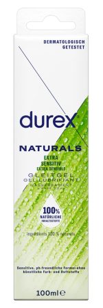 The crystal clear lubricant, Naturals from Durex, is made out of 100% natural ingredients and was developed to make sex even smoother. The gentle water-based formula is odourless, colourless and pH neutral. Valuable Biolin supports the intimate balance and also adds more moisture. Suitable for toys. Compatible with latex condoms.