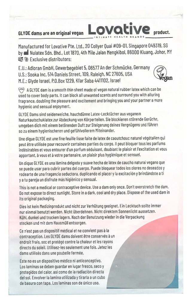 The GLYDE Dams VANILLA offer reliable, hygienic protection and are very comfortable to use during oral sex. The vegan, cream-coloured dental dams are made out of natural rubber latex and they are also extremely thin and silky soft for a comfortable and realistic experience. The protective dental dams are a generous size (25 x 15 cm), which means that they will cover the area properly during cunnilingus or a rim job. The subtle vanilla flavour underlines this very special moment with a warm, sensual note. The dental dams are individually wrapped for maximum hygiene. They come in a practical, round box and are ready to be used straightaway.