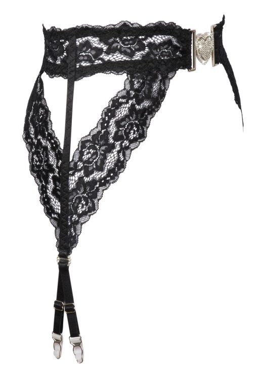 Svart spets-höfthållare från Cottelli LINGERIE i en snygg skärning med silverfärgade detaljer. Helt av fin, svart spets – mjuk och elastisk för maximal komfort. Framtill med fint spänne med ett glittrande hjärta. Med glittrande ring på sidorna och 2 justerbara strumphållare.
