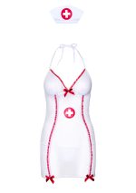 Hot Nurse Roleplay Set – Hot Nurse roleplay set, including a halter mini-dress in lace and sheer mesh, a matching string, stockings and a headpiece (bobby pins not incl.)