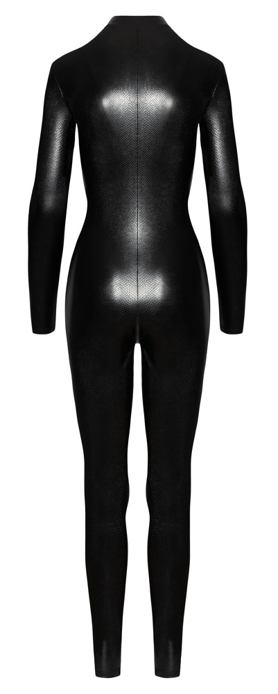 Tajt skuren, midjebetonande, långärmad overall från Noir i matt glänsande, glimrande ormskinnslook – sitter som en andra hud. Mjuk och elastisk för maximal komfort. Med praktisk 3-vägs-dragkedja av metall som går från den lilla ståkragen genom grenen till över rumpan.