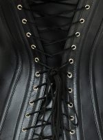 dragkedja framtill och spännen, baktill med snörning. Axelbanden kan justeras. Strumphållarna är justerbara och kan tas av. Svart. Utan string och strumpor.