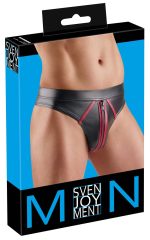 This sexy thong from Svenjoyment is made out of black wetlook with contrasting red stripes that frame the front in a stylish way. There is a zip at the front as well. The thong is soft and stretchy, and it also has a stretchy fabric-covered waistband as well for a very comfortable fit.