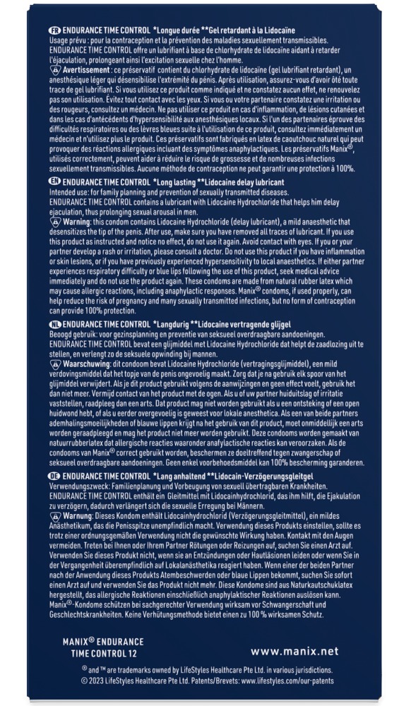 The condoms, Endurance Time Control from MANIX, can prolong sex because they have delay gel (lidocaine) inside. They can reduce sensitivity and therefore increase the duration of an erection for longer-lasting sex. In a cylinder shape. Teat-ended.
