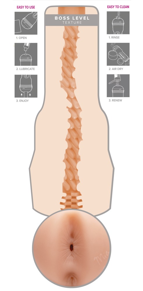 Masturbatorn Mia Malkova Boss Level från Fleshlight med anusöppning i ett pärlemorsfärgat hölje. Med orginalavtryck av erotikstjärnans Mia Malkovas anus. Inuti lustkanalen ger olika stora noppor och räfflor stimulation. Med lock och stjärnans underskrift bredvid blygdläpparna.