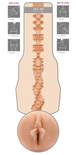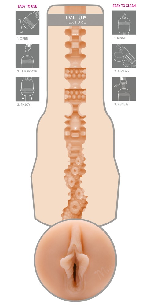 Masturbatorn Mia Malova LVL up från Fleshlight med vaginaöppning i ett pärlemorsfärgat hölje. Med orginalavtryck av erotikstjärnans Mia Malkovas vagina. Inuti lustkanalen ger olika stora noppor och räfflor stimulation. Med lock och stjärnans underskrift bredvid blygdläpparna.