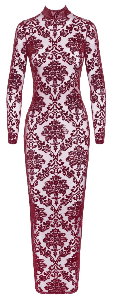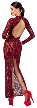 The long-sleeved, tapered dress Kink Royal from Noir is ankle-length and in a breathtaking burgundy red colour. It is also decorated with velvet flock print as well. It is soft and stretchy for a very comfortable fit and freedom of movement. There is a large cut-out at the back. It also has an elegant stand-up collar with a hook fastener at the back. The very high slit at the back of this skin-tight dress ensures optimum freedom of movement and adds the finishing touch to this seductive look.