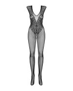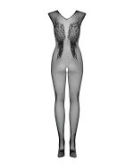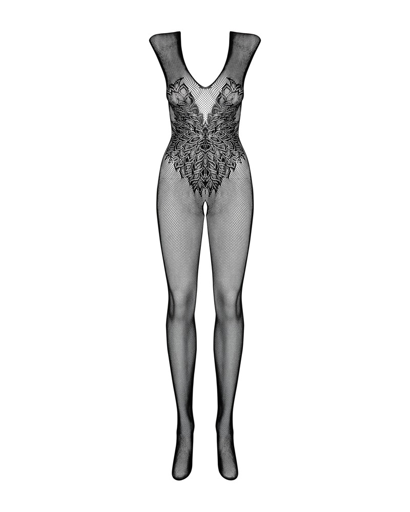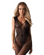 Svart nätcatsuit från Obsessive med invävda vingmotiv. Mjuk och elastisk för maximal komfort. Djupt urringad framtill. Inbjudande öppen i grenen. Med fot.