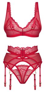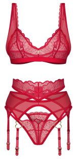 The 3-piece set, Cupide Desir from Obsessive, contains a bra, suspender belt and thong. The set is in a delicate lace look and made out of sensual transparent red material with gold-coloured details. It is soft and stretchy for a very comfortable fit. The bra has a discreet decorative detail between the wireless cups. The bra straps can be adjusted to fit. The suspender belt has a decorative heart on the front of both suspender straps. The suspender straps can also be adjusted to fit.