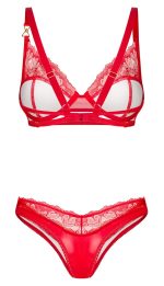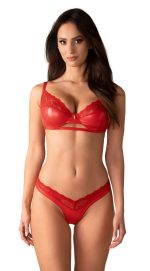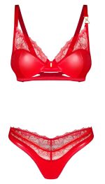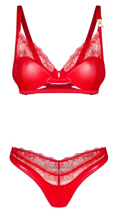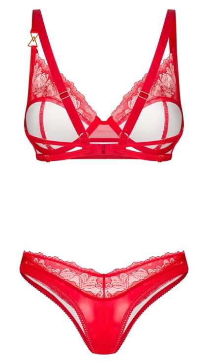 The Aliosa set from Obsessive contains an underwired bra and thong. The set is in a seductive style and in a sensual red colour – it is made out of beautiful shiny, smooth material and delicate, transparent floral lace. It is also soft and stretchy for a very comfortable fit. There is a discreet decorative gold-coloured detail between the underwired cups and on one of the bra straps. The straps and the hook fastener at the back can be adjusted to fit.