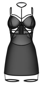 The tight-fitting chemise Arrowel from Obsessive is made out of transparent black powernet with delicate lace at the front. It is soft and stretchy. It also has fancy stretchy straps on the soft underwired cups. An adjustable strap leads to the adjustable choker. The straps and the hook fastener at the back, which is almost completely uncovered, can also be adjusted to fit. The suspender straps with adjustable thigh straps are firmly sewn onto the hem (there is one at either side)