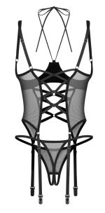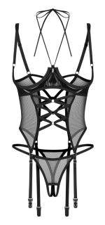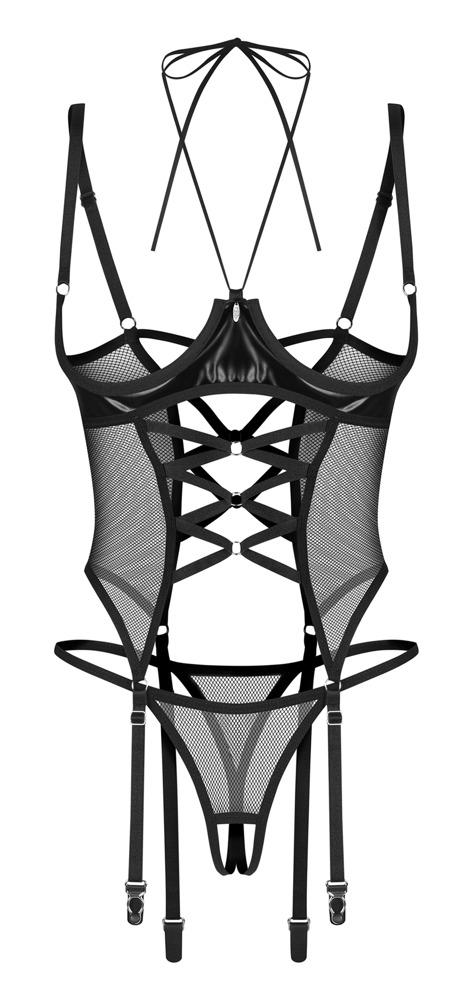 The open cup basque Dominna from Obsessive comes with a crotchless thong. It is made out of a stylish mix of soft, delicate net and stylish wetlook. There is also decorative and revealing lacing the front and the back. The thin halterneck can be tied together. There is a small decorative element between the open cups. The bra straps and the 2 suspender straps at the front can be adjusted to fit. The seductively crotchless thong adds the finishing touch to this exciting outfit.