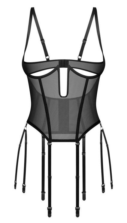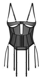 The open cup corset Euphori from Obsessive is extremely seductive because it is in a minimalistic style and made out of exciting transparent material, The delicate black powernet clings sexily but gently to the skin. The underwired cups support the uncovered breasts to create a beautiful shape. The shaping wires create a sexy silhouette and they emphasise the waist as well. The bra straps and the 2 hook fasteners at the back can be adjusted to fit. The 8 suspender straps are also adjustable and they can be removed as well.