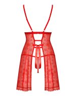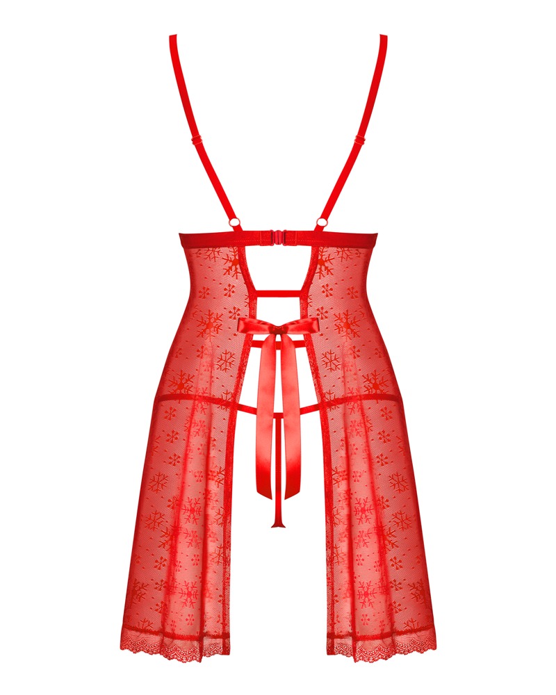 Det röda underklädessetet Claussica från Obsessive innehåller en chemise och snöre. Delikat stretchig tyll med snöflingamönster. Setet är också mjukt och stretchigt för en mycket bekväm passform. Det finns dekorativa vita pompoms framtill på remmarna. Den är helt rygglös med krokfäste och satinband. Med justerbara remmar. Det finns en liten dekorativ detalj mellan de trådlösa kopparna.