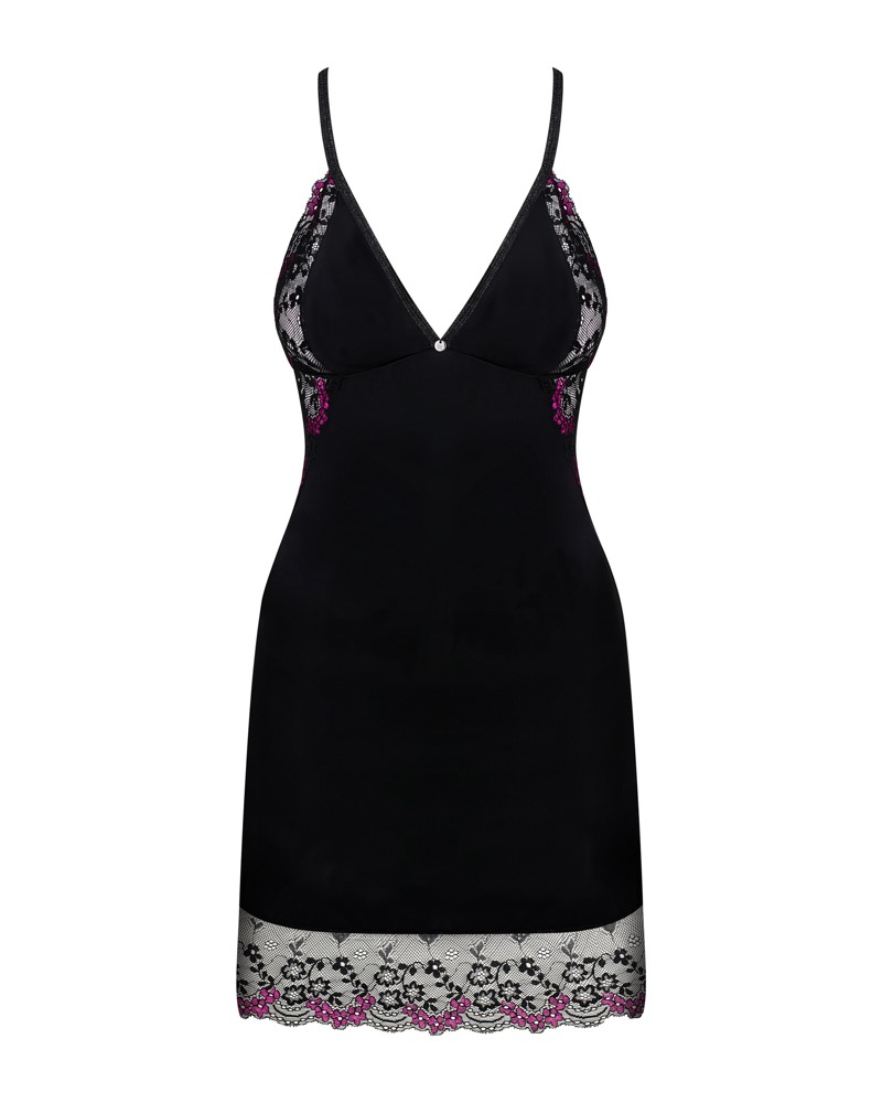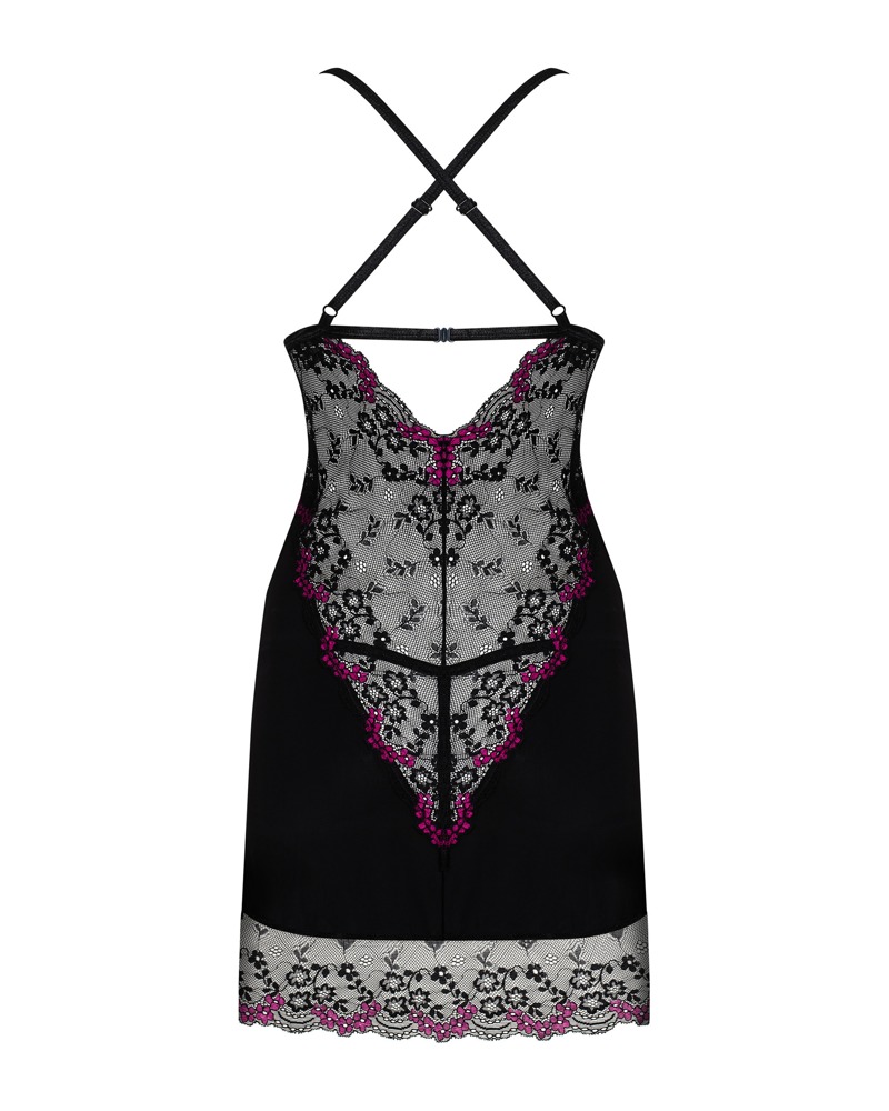 Figurbetonande underklänning och matchande string i settet Vanessme från Obsessive. I en snygg mix av ogenomskinligt svart stretchmaterial och genomskinlig tvåfärgad spets. Allt mjukt och elastiskt för maximal komfort. Med mjuka kupor och hakknäppning baktill. De justerbara axelbanden korsas baktill i den bara ryggen.