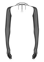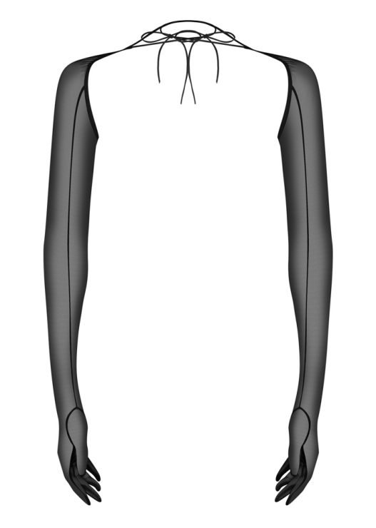 The very long gloves Euphori from Obsessive are made out of transparent black powernet. They are soft and stretchy, and they fit like a second skin. They go right up to the shoulders and can be tied to bra straps or at the back of the neck with their ribbons for a secure fit. They can be combined easily with other lingerie and add that little extra to evening wear.