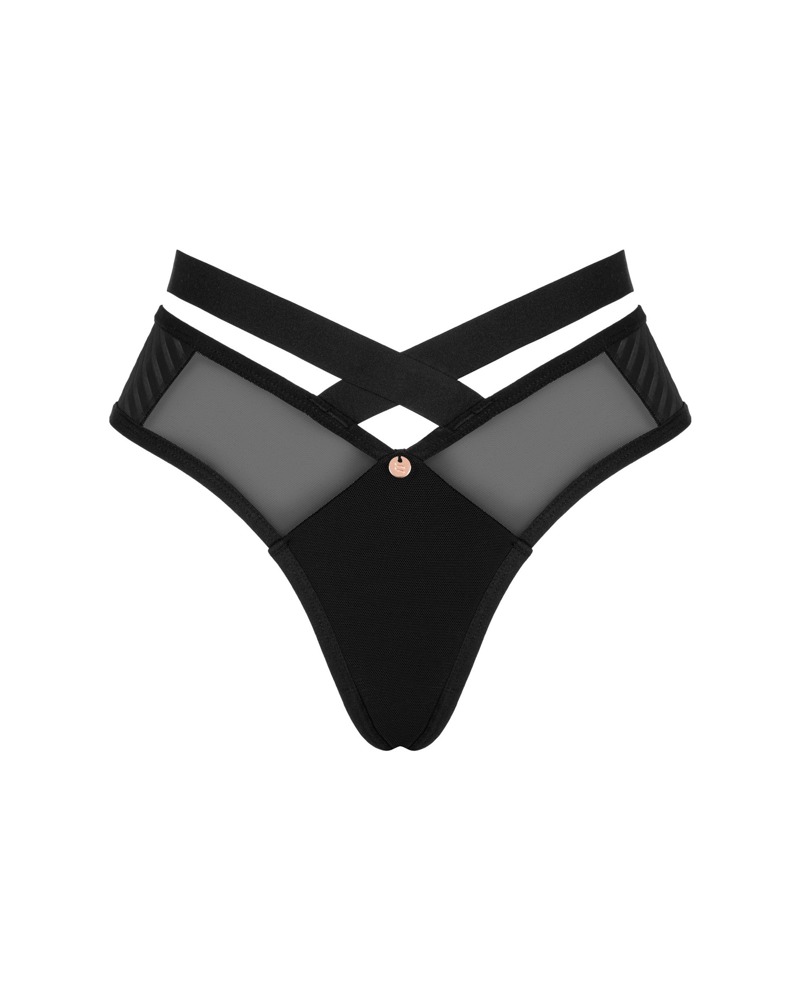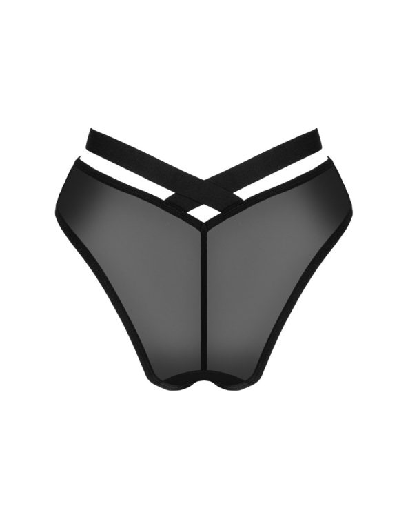 Läckert skurna trosan Brasica från Obsessive i en svart transparens med ogenomskinliga detaljer. Mjuk och elastisk för maximal komfort. Snygg linning med korsade stretchband framtill och baktill.