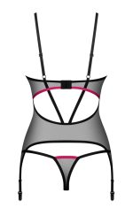 The 2-piece suspender set, Novenes from Obsessive, has a basque and thong. Everything is made out of delicate black powernet with pink strap accentuation. There are straps over the cleavage area and a beautiful rhinestone element between the wireless cups. The bra and suspender straps can be adjusted to fit. The basque also has a hook fastener at the back as well. The small thong adds the finishing touch to this elegant, transparent set.