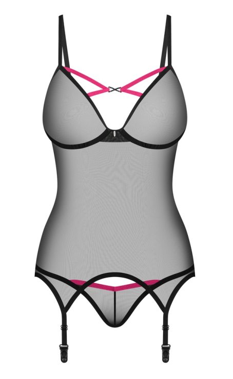 The 2-piece suspender set, Novenes from Obsessive, has a basque and thong. Everything is made out of delicate black powernet with pink strap accentuation. There are straps over the cleavage area and a beautiful rhinestone element between the wireless cups. The bra and suspender straps can be adjusted to fit. The basque also has a hook fastener at the back as well. The small thong adds the finishing touch to this elegant, transparent set.