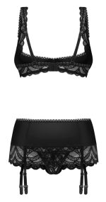 The black 3-piece set Lecille from Obsessive is made up of an underwired shelf bra, suspender belt and crotchless briefs. It is in a fancy style and has elaborate lace details. It is also soft and stretchy for a very comfortable fit. The shelf bra’s slightly padded cups support the uncovered breasts is a perfect way. The small decorative bow between the cups is a real eye-catcher. The hook fastener at the back and the bra straps can be adjusted to fit. The stretchy and slightly wider suspender belt fits like a second skin. It also has a small eye-catching element at the front of its waistband. The suspender straps can be adjusted to fit as well. The beautiful lace briefs are seductively crotchless.