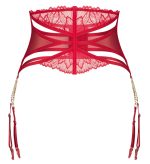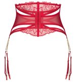 The Matildea suspender belt from Obsessive is in a deep red colour and has transparend net tulle, delicate lace and gold-coloured chains connecting the suspender straps to the suspender belt. It has a vertical wire for a perfect fit. There is also an adjustable hook fastener at the back. The 4 suspender straps can also be adjusted to fit.