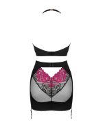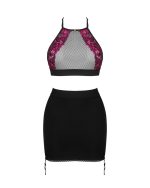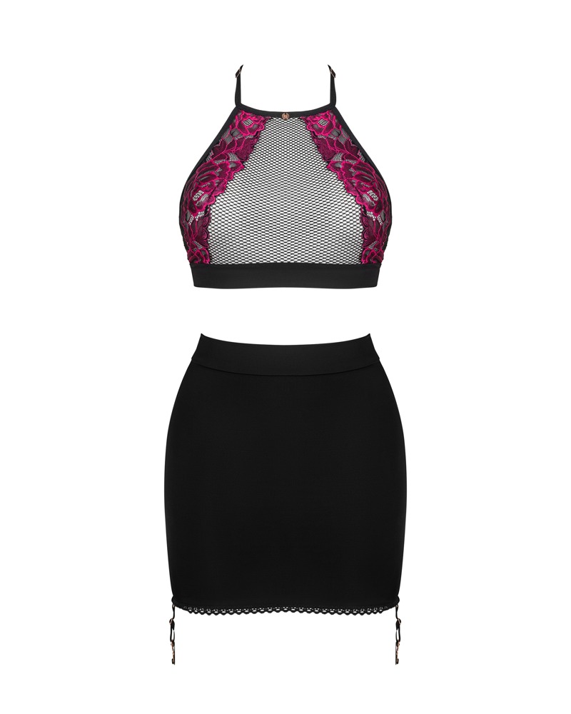 Top och strumphållarstring i settet Rosenty från Obsessive som läckert presenterar urringning och rumpa med mjukt nät och rosa rosspets. Det ogenomskinliga stretchmaterialet sitter som en andra hud. Med genomskinliga insatser framtill på toppen och baktill på kjolen. Toppen kan justeras på neckholdern och stängs med en justerbar hakknäppning i den bara ryggen. Även den tajta, korta kjolen har en hakknäppning baktill. Strumphållarna kan justeras och även tas av helt.
