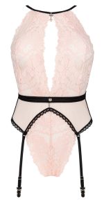 Stringbodyn Lilines från Obsessive av roséfärgad, mjuk spets med inarbetad höfthållare av mjukt powernet. Med svarta kontrastdetaljer och snygg prydnadssmycke över den djupa urringningen. Nästan bar rygg. Mjuk och elastisk för maximal komfort. Axelbanden och strumphållarna kan justeras så att plagget sitter perfekt.