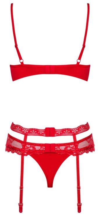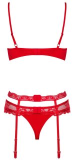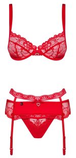 BH, höfthållare och riostring i ett 3-delat set Heartina från Obsessive med ädel spets och glittrande strass. Axelband och strumphållare kan justeras.