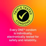 The transparent, flavoured condoms, Flavor Waves from ONE, are in 6 flavours for tasty oral sex: chocolate-strawberry, Island Punch, Fresh Mint, Bubblegum, Mint Chocolate and Banana Split. There are no sugar or sweeteners in any of the flavours. Every condom in the pack is suitable for oral sex. The contoured shape with a teat-end means that they are a perfect and comfortable fit – the extremely soft Sensatex natural rubber latex provides a natural feeling of pleasure. They are vegan and genetically unmodified. Covered in silicone oil.