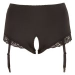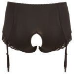 Svart trosa med komplett öppen gren. Med fyra justerbara och avtagbara strumphållare. Med elegant spets. Det fastare tyget framtill ger en lite lätt “bort-med-magen-effekt”. 95% polyester, 5% elastan.