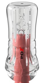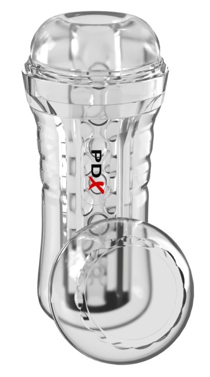 Transparent masturbator ViewTube Plus See-Thru EZ-Grip Stroker Clear from PDX Elite in an easy-to-hold transparent case with protective lid. The penis is massaged all around by intense textures in the ultra-soft sleeve. For rhythmic handjobs that everyone can watch! The vacuum opening at the end of the masturbator provides additional suction sensations, just like the best blowjob. One finger is used to open and close the opening to vary the suction power (suction control).