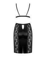 BH och kjol i det svarta settet Blanita från Obsessive av stretchsatin och fin spets. Mjuk och elastisk för maximal komfort. Soft-BH med hakknäppning baktill. Axelbanden kan justeras. Den knälånga, kroppsbetonande kjolen har en liten slits och hakknäppnign baktill.