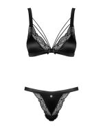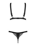 Svarta settet Eloissa från Obsessive med soft-BH och string av ädel satin med fin spets. Mjuk och elastisk för maximal komfort. BH med kupremmar och rosettdetaljer. Axelbanden kan justeras. Stringen förför med en smyckesdetalj framtill och pyntrosett över rumpan.